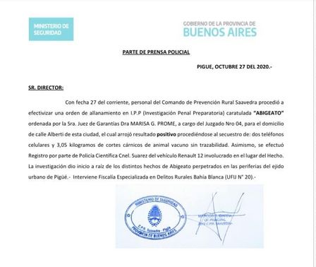 El reporte de la Comisaría de Pigüé expresa que “con fecha 10 del corriente personal policial del G.T.O de esta Dependencia, a raíz de las tareas investigativas realizadas oportunamente, procedió a dar cumplimiento en Orden de Allanamiento I.P.P caratulada “Investigación de comercialización de estupefacientes (Art. 5 Inc. C Ley 23.737)”, dispuesto por el Juzgado de Garantías Nº 1 del Dpto. Judicial Bahía Blanca, para el domicilio de calle Av. Clemente Cabanettes y Tucumán Dpto. Nº 1 de nuestra ciudad, arrojando resultado positivo y procediéndose al secuestro de: 06 envoltorios de nylon conteniendo sustancia blanca, arrojando un pesaje de 6,96 gramos, y test de orientación positivo para cocaína; incautándose elementos de corte y fraccionamiento, 4 teléfonos celulares, dinero en efectivo ($16.650,00) pesos argentinos de curso legal y libreta anotaciones varias, procediendo a la inmediata aprehensión de la moradora del lugar identificada como Erica Celeste Freuler (36). Asimismo con motivo de la misma investigación se cumplimentó Orden de Registro y Requisa Personal sobre el vehículo Fiat Fiorino dominio AE124AZ propiedad del ciudadano Fernando Andrés González (39), secuestrando en su poder 2 teléfonos celulares.