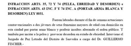 El mensaje de la Comisaría de Pigüé asevera que "en operativos de interceptación de personas e interceptación vehicular, personal de la Comisaría de Pigüé Seccional Primera, procedió a la aprehensión de los ciudadanos Fernando Ramón Cisnero, de 45 años, y Darío Fernando Cisnero, de 43 años, ambos con domicilio en Coronel Suárez. Quienes fueron interceptados en cale San Martín al 367 de este medio a bordo de un vehículo marca Honda Fit LX L dominio FHT 972, observándose en el interior del rodado una caja de zapatos conteniendo sustancia vegetal verduzca simil marihuana (cogollos), procediendo su secuestro.