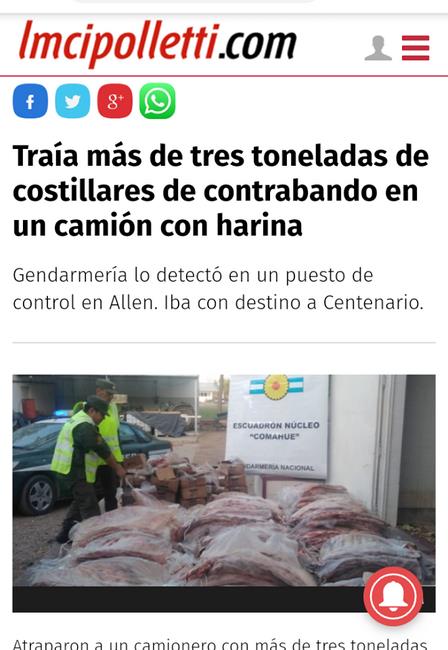 El diario La Mañana de Cipoletti señala textualmente "atraparon a un camionero con más de tres toneladas de carne vacuna con hueso escondida entre la carga de bolsas de harina proveniente de la provincia de Buenos Aires con destino a Centenario.