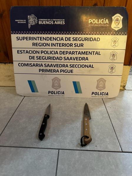 Ante presencia personal policial, el agresor Maldonado Walter se torna hostil, no declinando su actitud e increpando a los efectivos policiales, por lo que se procede a su inmediata aprehensión y secuestro armas blancas. Víctima es trasladada a Hospital Municipal Pigue fines atención primaria. Imputado permanece alojado en Calabozos de esta Seccional, a disposición judicial. Interviene: UFIJ N°15 y Juzgado de Garantías N° 1, ambos del Departamento Judicial de Bahía Blanca".