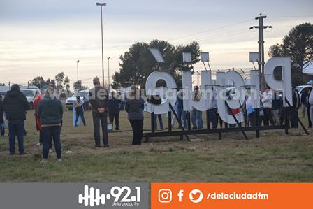 Los manifestantes entonaron el Himno Nacional Argentino en la Rotonda de Pigüé que une Ruta 33 con 67.