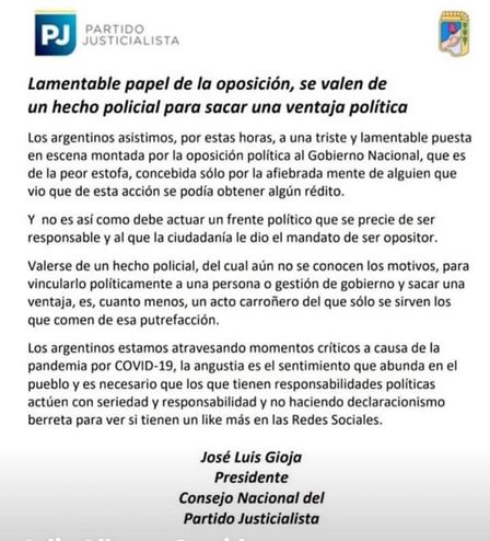 El mensaje asevera que "desde el Partido Justicialista del Distrito de Saavedra, acompañamos y adherimos al documento dado a conocer por el PJ Nacional, rechazando el comunicado publicado por los Presidentes de los partidos políticos que conforman la Alianza Cambiemos. Creemos que es de una bajeza terrible intentar sacar ventaja de un hecho policial. Estamos seguros de que en la vida y en la política no es ético ni moral la regla del “vale todo”.