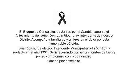 El bloque de concejales de Juntos por el Cambio, en un parte de prensa, consideró que "lamenta el fallecimiento del Señor Don Luis Ripani".