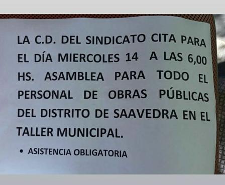 La Asamblea del Sindicato de Trabajadores Municipales se realizará para todo el personal de Obras Públicas.