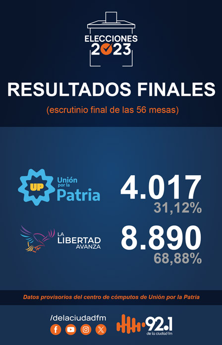 Resultado final en el partido de Saavedra Escrito por Martín Arriaga Zugasti el 19 Noviembre 2023. Publicado en Política < Anterior Siguiente >