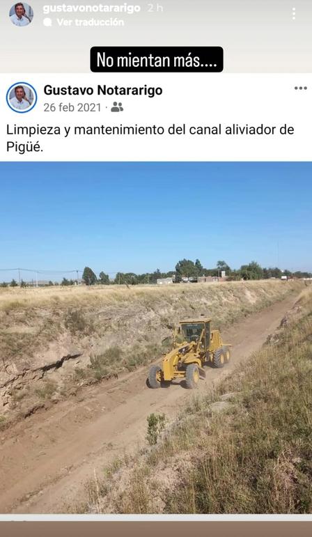 Quien fuera Jefe Comunal del Partido de Saavedra publicó una imagen, con una maquinaria trabajando sobre el canal derivador, junto a la fecha del 26 de febrero del 2021.