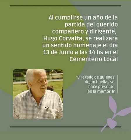 El mensaje del Consejo de Partido del justicialismo distrital dice "al cumplirse un año de la partida del querido compañero y dirigente, Hugo Corvatta, se realizará un sentido homenaje el día 13 de junio, a las 14.00 horas, en el Cementerio Local".