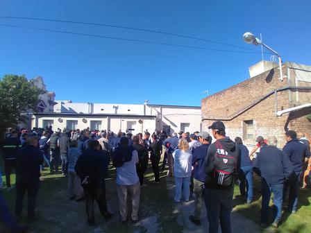Discutiendo distintas cuestiones los operarios de la administración comunal se encuentran reunidos en el sector del patio del Hospital Pigüé.