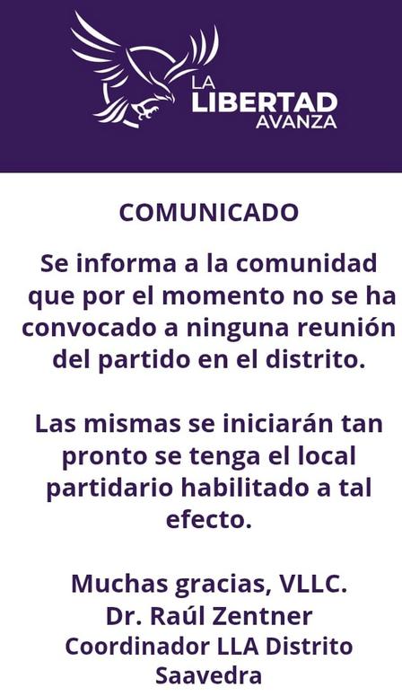 El parte de prensa que lleva la firma de Raúl Zentner indica, textualmente que "se informa a la comunidad que por el momento no se ha convocado a ninguna reunión del partido en el distrito".