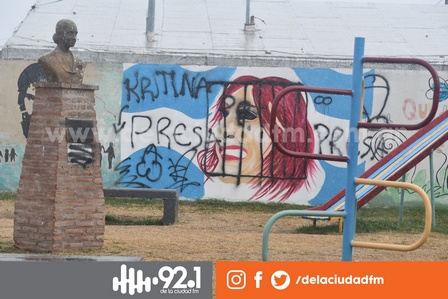 Pintaron con varios mensajes el mural de la Plaza Eva Perón