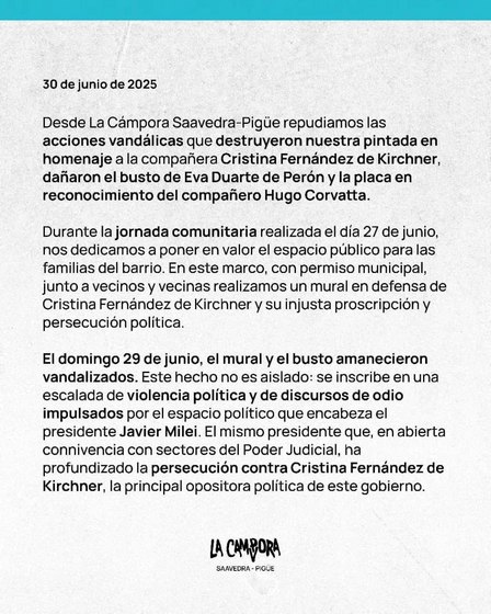 El parte de prensa expresa "desde La Cámpora Saavedra Pigüé repudiamos las acciones vandálicas que destruyeron nuestra pintada en homenaje a la compañera Cristina Fernández de Kirchner, dañaron el busto de Eva Duarte de Perón, y la placa en reconocimiento del compañero Hugo Corvatta.