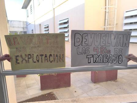 Entre los mensajes indican 'La vocación no significa explotación' y sostienen 'Devuelvan las 48 horas de trabajo'