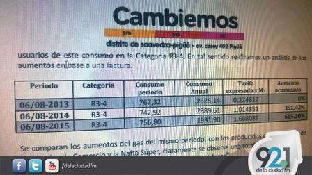 El PRO presentó un trabajo que se expresa sobre 'El por qué y las razones de un gas cada vez más inaccesible. Nuevamente la población del distrito se ve sacudida fuertemente por las recientes facturas de gas con importes a pagar que exceden la posibilidad de muchos. Ya recibieron su factura en Pigüé quienes tienen domicilio en calles paralelas a las avenidas Cabanettes y Mitre superando toda comprensión de razonabilidad, interpretamos que Nación, Provincia y Municipio perciben un ingreso relacionado al consumo de gas, que dudosamente forma parte del consumo propiamente dicho".