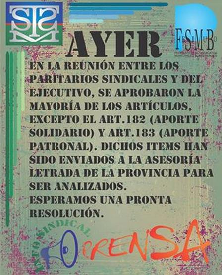 Durante el día de ayer los paritarios sindicales se reunieron con el Departamento Ejecutivo para aprobar la mayoría de los artículos, excepto el número 182 que preveía el aporte patronal.