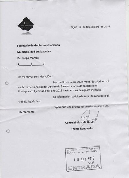 En un comunicado Luis Gribaldo afirma que "esta nota certifica que el Concejal Luis Gribaldo, Presidente del Bloque del Frente Renovador del Distrito de Saavedra, no tenía conocimiento del pedido de informe realizado por la Concejal Marcela Guido, solicitando el Presupuesto Ejecutado del año 2.015. Por lo cual, desmiento los dichos de la Concejal en conferencia de prensa del día 20/10/2015 pasado, de que yo estaba en conocimiento de su pedido y posterior toma del municipio.