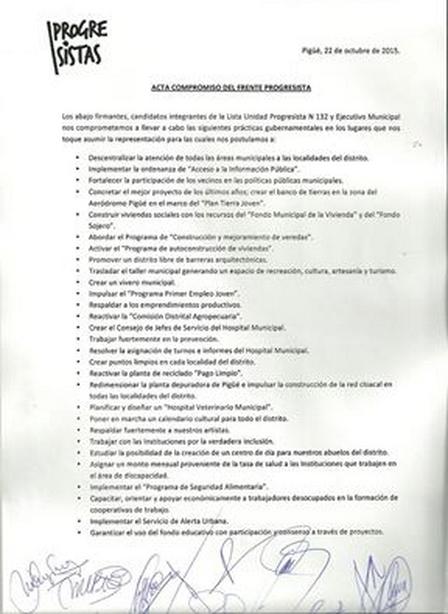 Todos los candidatos del Frente Progresistas, y quienes integrarán el Ejecutivo Municipal, firmaron un acta compromiso.