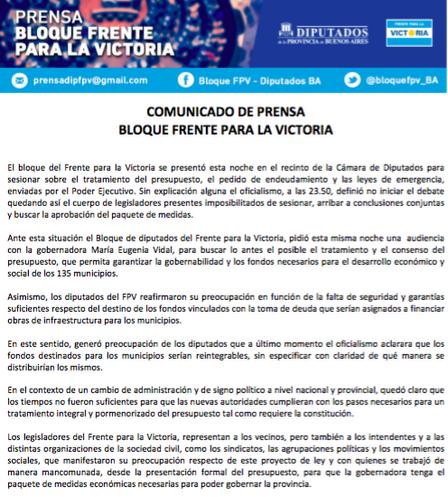 En un comunicado publicado en las redes se asegura que "el FPV no pudo tratar el presupuesto porque el oficialismo definió no iniciar el debate y suspender la sesión".