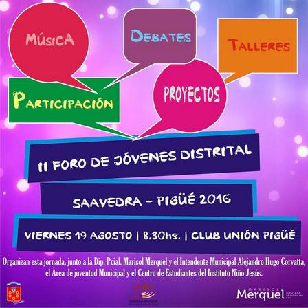 El viernes 19 de agosto, a las 8.30 horas, en el Club Unión Pigüé, estará llevándose a cabo el Segundo Foro de Jóvenes Distrital.