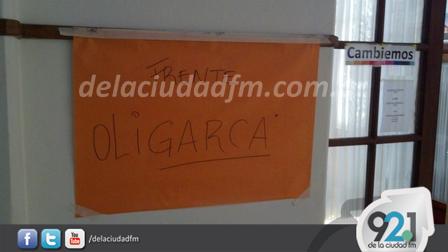 Los manifestantes colocaron un cartel que dice 'Frente Oligarca' en la Oficina de Cambiemos