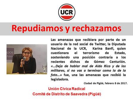 El mensaje de la UCR local expresa 'repudiamos y rechazamos las amenazas que recibiera por parte de un usuario de la red social de Twitter la Diputada Nacional de la UCR Karina Banfi".