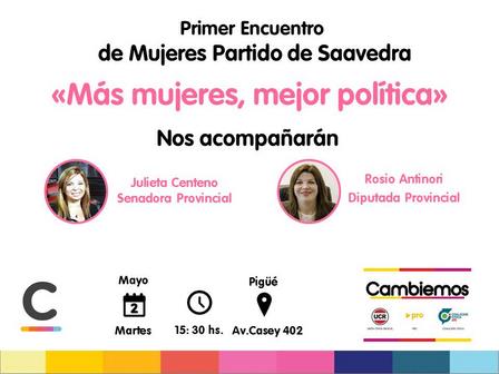 En el Primer Encuentro de Mujeres del Partido de Saavedra organizado pro Cambiemos la Diputada Provincial Rosío Antinori y la Senadora Julieta Centeno estarán al frente del panel 'Más mujeres, mejor política'.