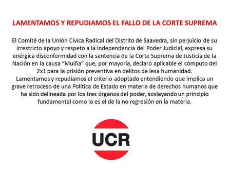 La UCR emitió un comunicado en el que asevera que 'sin perjuicio de su irrestricto apoyo y respeto a la independencia del Poder Judicial, expresa su enérgica disconformidad con la sentencia de la Corte Suprema de la Nación'.
