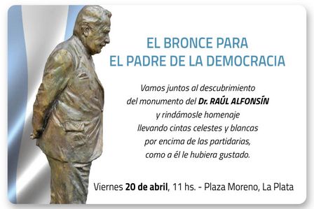'El bronce para el Padre de la Democracia' dice la invitación de la Unión Cívica Radical para participar del acto que tendrá lugar el viernes 20 de abril en la Plaza Moreno.