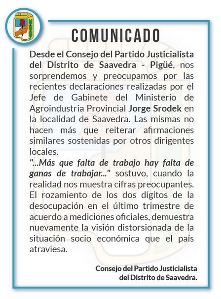 El mensaje expresa que "desde el Consejo del Partido Justicialista del Distrito de Saavedra - Pigué nos sorprendemos y preocupamos por las recientes declaraciones realizadas por el Jefe de Gabinete del Ministerio de Agroindustria Provincial Jorge Srodek en la localidad de Saavedra. Las mismas no hacen más que reiterar afirmaciones similares sostenidas por otros dirigentes locales.
