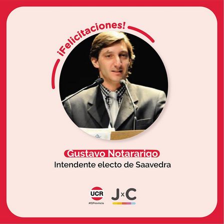 El mensaje expresa “Felicitaciones Gustavo Notararigo - Intendente radical electo de Saavedra”.