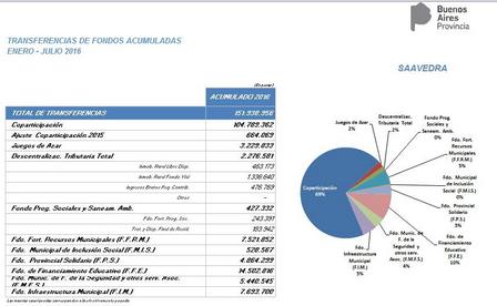 El informe presentado por el PRO local afirma que se ha dado una transferencia de fondos acumulados en el período Enero - Julio 2016 que supera los 150 millones de pesos.