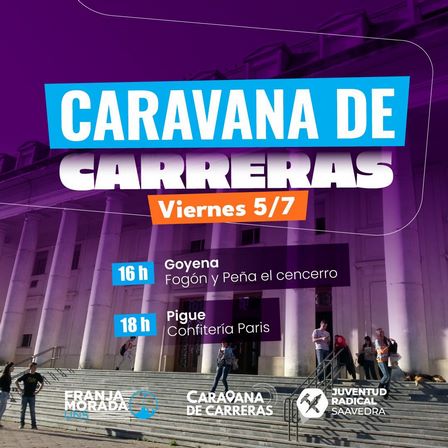 Este viernes, 5 de julio, la Juventud Radical junto a Franja Morada de la Universidad Nacional del Sur, la Caravana de Carreras programa charlas tanto en Goyena como en la localidad de Pigüé contando con la invitación abierta a los espacios del Salón del Fogón y La Peña El Cencerro y de Confitería París.