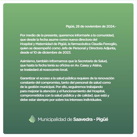 El anuncio formal fue dado a conocer, a través de un comunicado, por las autoridades distritales del Municipio de Saavedra – Pigüé.