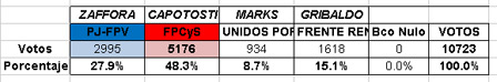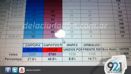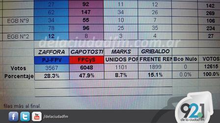Según le indicaron a FM de la Ciudad el total de votos para el Frente Progresista Cívico y Social fue de 6.101, seguido por el Frente para la Victoria de 3.643, el Frente Renovador con 1.933 votos, 1.061 votos del Frente Unidos por la Libertad y el Trabajo.