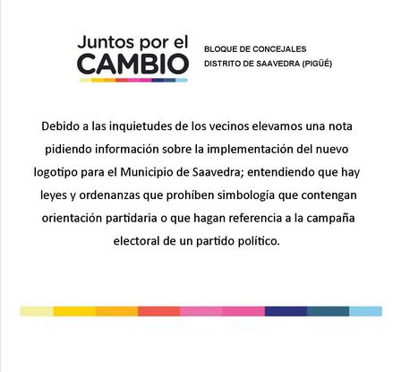 El mensaje dice "debido a las inquietudes de los vecinos elevamos una nota pidiendo información sobre la implementación del nuevo logotipo del Municipio de Saavedra".