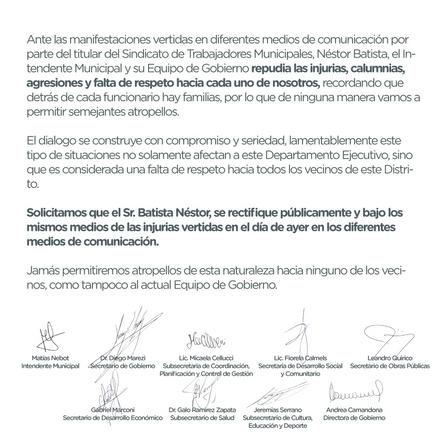 El comunicado dice "ante las manifestaciones vertidas en diferentes medios de comunicación por parte del titular del Sindicato de Trabajadores Municipales, Néstor Batista, el Intendente Municipal y su Equipo de Gobierno repudia las injurias, calumnias, agresiones y falta de respeto hacia cada uno de nosotros, recordando que detrás de cada funcionario hay familias, por lo que de ninguna manera vamos a permitir semejantes atropellos.