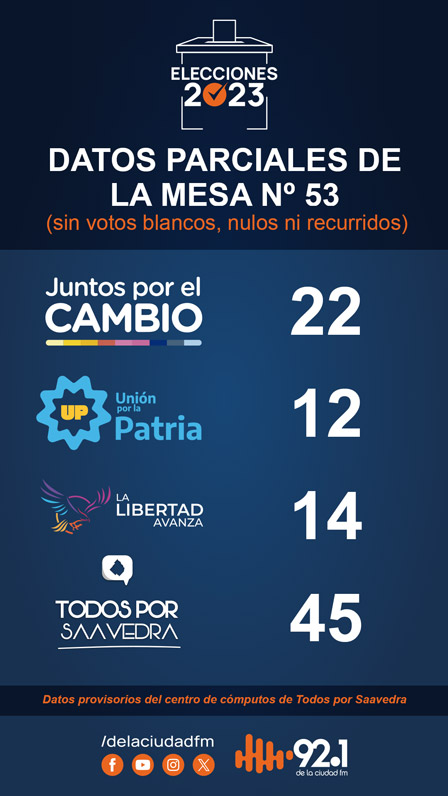 Los primeros datos provisorios del recuento de votos, en este caso la mesa 53 de la localidad de Espartillar, la primer mesa escrutada.
