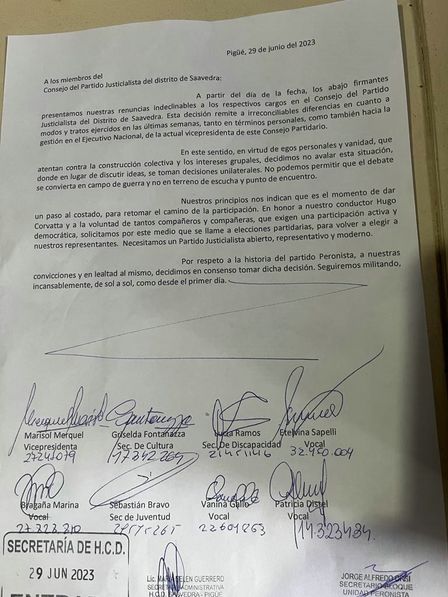 En un comunicado oficial, Marisol Merquel, apoyada por dirigentes del partido, confirmó sus renuncias por diferencias internas, dando a conocer este parte de prensa que dice "A partir del día de la fecha, los abajo firmantes presentamos nuestras renuncias indeclinables a los respectivos cargos en el Consejo del Partido Justicialista del Distrito de Saavedra. Esta decisión remite a irreconciliables diferencias en cuanto a modos y tratos ejercidos en las últimas semanas, tanto en términos personales, como también hacia la gestión en el Ejecutivo Nacional, de la actual vicepresidenta de este Consejo Partidario.