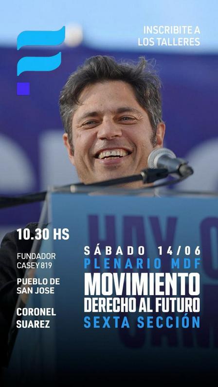 Con presencia de integrantes del Distrito de Saavedra, y de la Sexta Sección Electoral, el espacio que se referencia con el Gobernador Bonaerense Axel Kicillof tendrá un encuentro con talleres divididos en diversas temáticas, el día sábado 14 de junio, desde las 10.30 horas.