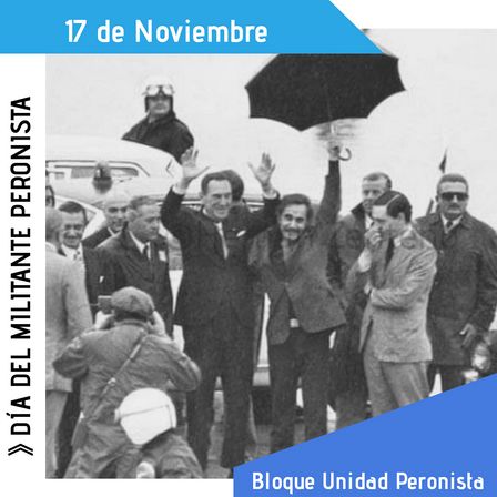 Por esa razón cada 17 de noviembre, con esperanza y alegría conmemoramos y celebramos el Día del Militante Peronista. Hoy queremos hacerlo homenajeando a los miles de compañeros que sufrieron persecución, cárcel y exilio, que arriesgaron sus vidas y en muchos casos la perdieron, por traer a Perón de vuelta a su Patria, pero fundamentalmente a todos aquellos compañeros que día a día siguen trabajando en el Proyecto de Reconstrucción de la Patria que encabeza nuestro Presidente Alberto Fernández luchando incansablemente por lograr una Argentina Justa, Libre y Soberana, que nos incluya a todos. Feliz Día del Militante!”.