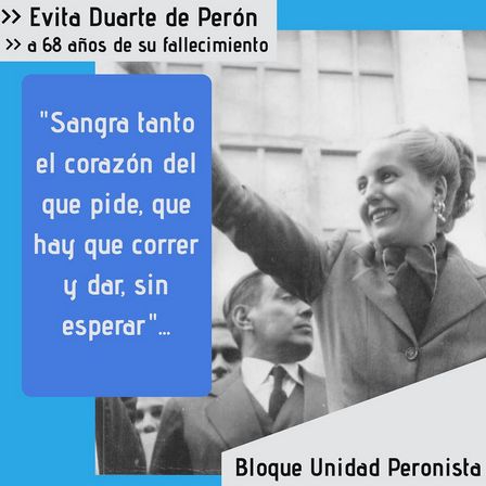 El mensaje indica que “al cumplirse hoy 68 años del fallecimiento de la Compañera Evita, queremos recordarla y homenajearla, saludando a todos los militantes que día a día llevan sus banderas y de Perón a cada hogar de nuestra querida Argentina.
