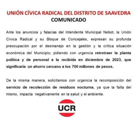 Un comunicado fue publicado por la Unión Cívica Radical del distrito en el transcurso de esta mañana luego de las declaraciones formuladas por las autoridades municipales.