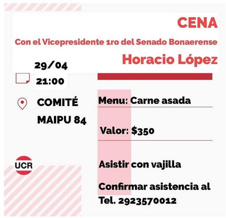 Aún en lugar a confirmar el Senador Horacio López estará dando una conferencia de prensa antes de participar de una cena organizada por la Unión Cívica Radical.
